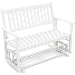 Description: Are you in search of a glider bench with safe and gentle gliding? Our outdoor glider bench offers just that! With smooth bearing arm brackets and a reinforced base frame, it provides a comfortable and smooth rocking motion for ultimate relaxation. Crafted from premium solid poplar wood, this patio glider loveseat chair is anti-crack, robust, and long-lasting. It supports a maximum load capacity of 225 kg, ensuring stability. Perfect for two people, the 2-person swing glider features an ergonomic slanted backrest and wide comfortable armrests. Its compact dimensions of 118 x 49 cm make it suitable for various outdoor spaces. Create a cozy spot in your backyard, garden, patio, or balcony. The glider bench's exquisite details include smooth bearing arm brackets for quiet gliding and a burr-free slanted seat surface with selected PU painting for longevity and easy cleaning. Elevate your outdoor space now! Features: Made of natural poplar wood for great durabilitySafe and
