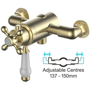 This exposed traditional shower mixer valve is one of the most versatile replacement shower valves on the market. This luxury brushed brass dual control shower valve features a ceramic level handle and has been constructed from solid brass.The traditional finish on this shower valve will colour match many old shower valves that would have traditionally been sold as a gold shower mixer valve. Featuring a ceramic level handle and indices traditional lever appearance of this Dual Exposed Thermostatic Shower Valve makes it the perfect addition to a period bathroom. It features the option of a top or a bottom outlet (comes as bottom as standard) for both 1/2"" rigid riser rails and standard shower hoses. Fully adjustable elbows between 137mm and 150mm all you to replace many old mixer showers with ease. Includes backing plate for ease installation. Elbows can also rotate to allow pipework to come into the valve from up or down the wall Dual control - Flow temperature are controlled
