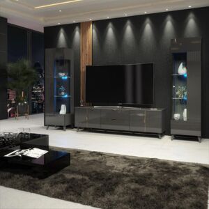 This living room set features a TV unit and two display cabinets. These are characterised by milled doors in high gloss graphite grey, body (top, sides and inside) in matt graphite grey, brushed gold handles, and grey feet. TV Stand The TV unit includes two cupboards and two drawers for extra storage. Suitable for TV's up to 75in. Dimensions (WxHxD): 180x54x40cm Display cabinets The cabinets feature a glass fronted door that can be assembled to open to the left or right. The display area has two glass shelves and a wooden shelf above and below, for additional storage. Dimensions (WxHxD): 50x182x40cm White LED lights are included with each display cabinet only (no LED lights in TV Stand). LED lights are mains powered with a UK power adapter. The foot switch is used to turn them on and off. Due to the nature of glass shelves, they will have a green hue. Note that these are flatpack items and will require assembly. Picture instructions, and supplementary notice are included, and should