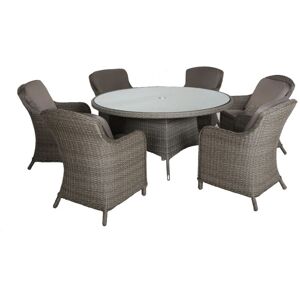 PARIS 6 Seater Round 140cm cm Table with 6 Imperial Chairs including Cushions The Paris 6 seater dining set comes complete with 6 imperial dining chairs, with weather shield seat and back cushions and a floating, tempered glass top table with built in parasol hole. It is the perfect setting for outdoor lunch or dining or to simply relax with a drink. Made from the highest quality polyethylene double round wicker around a rigid aluminium frame its durable and weather resistant, making this set the ideal choice for dining with family and friends. Features: Material: Synthetic Rattan Colour: Grey Cushion Colour: Grey Rust Proof Aluminium Frame Shower and stain resistant cushions Included Compliments any outdoor patio or decking space Set Includes : 1 x Round Table (with tempered glass top) 6 x Imperial dining Chairs 12 x Weather shield cushions Assembled Dimensions: Table: H74cm W140cm D140cm Carver Chairs: H90cm W62cm D60cm Box Dimensions: BOX 1: H: 142.5cm W: 9.5cm x L: 142.5cm BOX 2: