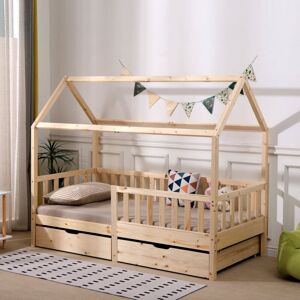 Size: 196(L)X97(W)X163(H)cm Material: Solid Pine Wood Color: Natural Mattress(WITHOUT): 90X190cm Description: Frame made of solid pine wood,strong and stable. Two large under-bed drawers can help you organize your items and store clothes,toys,and more. Treehouse design allows you to choose your own style of decoration,play unlimited possibilities.