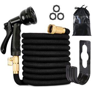 【 Flexible garden hose 】The garden hose can be extended up to 3 times its original length when in use, the water hose can be extended up to and retracted when the water is turned off without twisting or kinking. Simply drain the water from the hose when not in use, with hooks and storage bags for easy and space-saving storage. 【8 Pattern Watering Gun 】The expandable hose comes with an 8-pattern spray gun: FLAT (flat spray), CONE (conical spray), SOAKER (tank filling), FULL (powerful jet), ANGEL (angled jet), SHOWER (soft shower), MIST (fog spray),CENTER (concentrated jet). The flexible water hose meets all your watering and washing needs, ideal for watering garden plants, washing pets, washing cars and more. 【High quality and durability 】The flexible hose is made of high tenacity knitted polyester fabric and a flexible inner layer of 3 layers of 3mm thick latex hose, which can withstand temperatures from -4°F(-20℃) to 140°F(60℃) and water pressure from 3 to 12 bar. Don't worry about