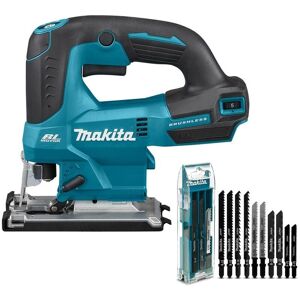 Makita DJV184Z 18V Brushless Jigsaw LXT Kit High cutting performance Tool-less blade clamp for easy blade change with one hand Orbital cutting function: 3 orbital settings + straight cutting Lock-on function Soft start LED with light up function during standby mode Variable speed control by trigger and dial Constant speed control Electric brake Anti-restart function Soft no-load mode Dust collection (forced dust collection) Compact and lightweight design This is a Bare Unit - does not come with batteries or charger Includes 25 Makita Jigsaw Blades Super Express Long Life Blades Wood Metal With this set you get 5 x Packs of Makita B-48527 jigsaw blade set includes 5 popular blades to cut a variety of materials including wood, steel, plastic, aluminium and stainless steel and includes a plastic double sided case. Features Super express superior performance with cordless saws with less vibration, fine cut, high speed cutting Ability to cut through thick and thin materials with the same