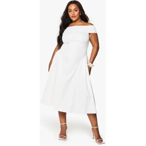 Elegant Bardot neckline showcasing shoulders for a flattering silhouette Voluminous A-line skirt that falls to a sophisticated midi length Fitted bodice creating a beautiful contrast with the full skirt Off-shoulder cap sleeves adding a touch of contemporary charm Versatile woven fabric that maintains structure whilst ensuring comfort This striking Boohoo Plus Bardot dress combines timeless elegance with modern flair. The off-shoulder design beautifully frames your dcolletage, whilst the voluminous midi skirt creates a captivating silhouette that moves gracefully with every step. Style with strappy heels and statement jewellery for evening soires, or dress down with flat sandals and a woven tote for daytime sophistication. The adaptable design transitions seamlessly from office to evening drinks - simply switch your accessories to transform your look. Add a tailored blazer for more formal settings or embrace the dress's elegant simplicity on its own. The classic shape works brilliantly for garden parties, dinner dates, or any occasion where you want to make a refined yet effortless impression.