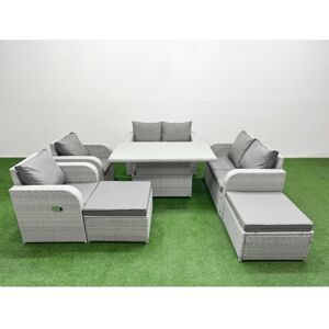 This deluxe PE rattan sofa set is a great addition to patio or garden, made of high quality PE rattan and durable galvanized steel. Pls kindly leave your mobile number at checkout for not delaying your shipment . Set dimensions:2 x Reclining chairs Size: 74W x 69D x 79H cm 2 x Love Sofa Size: 124W x 67D x 79H cm 2 x Fully Assembled Stools :40W x 40D x 34H cm 1 x Side table 65L x 65W x 66H cm 1 x Lifting Table Size: 140L x 80W x 68/48H cm (height up 68,down48) Sofa Weight Capacity: 250kg Table Weight Capacity: 80kg Light grey rattan with dark grey fabric .Color may vary due to light or monitor .we are unable to return the item due to this problem .Please contact us before purchase if you have requirements on color saturation . The 2 armchairs are adjustable, you can adjust the inclination of the chair back from 90-130 through the button . Items Comes Flat Packed And Easy to Assemble,Sturdy Galvanized Steel Tube Metal Frames With Powder Coating To Prevent The Rust Ergonomic High Back And Declining Design For Extra Comfort Flat PE Rattan Completely Made By Hand, 5mm Thick Transparent Tempered Glass With Sucker On Surface To Prevent Sliding8 CM Thick Seat Cushion With Soft Back Cushion Gives You More Comfort. Low Maintenance ,Removable Cushion Cover And Easy Move To Different Place.Pls Keep the Cushion Indoor Or put on With Rain Cover When Not In Use . put on The Furniture With Rain Cover If Not in Use For Long Time . Factory Direct Sale Guarantee The Quality And After Sale Service. Important notice: pls check the product carefully before signing it .if there is any obvious damage when arrive ,pls kindly mark on the receipt .we will file claim to the courier and send the replacement .thank you This item is for kerbeside delivery , we can't deliver to your room . WARRANTY&SUPPORT:Though we have nearly 100% checked before shipment , but as this item is 100% handmade so If you have any issues of assembly, missing parts,damaged or other problems of product quality of this outdoor rattan furniture set, please feel free to contact us, and our after-sales team will respond within 24 hours and offer you the most perfect and powerful solutions.