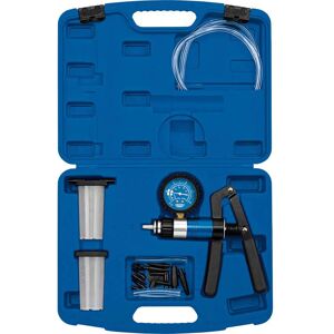 Expert Quality, compatible with most vehicles. Kit includes comprehensive equipment for bleeding brake and clutch units. Also suitable for fault finding common issues with; air conditioning, fuel, transmission, turbo waste gates, valve stem oil seals, ignition and emissions. Dual reading gauge 0 - 60psi/0 - 1bar. Easily dismantled for cleaning. Supplied in a plastic storage case. Features and Benefits • Expert Quality, • Compatible with most vehicles • Includes comprehensive equipment for bleeding brake and clutch units • Suitable for fault finding common issues including air conditioning, fuel, transmission, turbo waste gates, valve stem oil seals, ignition and emissions • Dual reading pressure 0-60psi/0-1bar • Easily dismantled for cleaning • Supplied in a plastic storage case Contents 1 x 63mm Gauge and pump 1 x 32mm Suction cup 1 x Tapered hose adaptor 1 x Gun cone 2 x 120ml Reservoir 3 x Bleed nipple adaptors 5 x Extension tubes 8 x Hose end cones