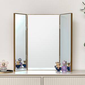This Large Gold Dressing Table Triple Mirror is a simple yet stylish table top mirror perfect for placing on a dressing table chest of drawers or bathroom vanity unit. Made of wood and glass this mirror has a rectangular shape with a triple mirror design and a gold frame. Perfect for placement in a bedroom bathroom or dressing room space. A great gift choice for make up lovers or fans of vintage style and luxurious mirrored finishes. A pretty mirror choice for fans of mirrored decor and art deco style. Part of a large collection of table top mirrors available in a selection of styles sizes and designs. Want to see more items like this? Browse our mirrors category for more options. Colour: Gold Material(s): Wood Glass 70cm x 60cm x 2cm (width x height x depth) Fully assembled