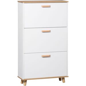 Protect shoes, in a space-conscious way with this HOMCOM narrow shoe cabinet. The two doors protect footwear from dust and similar to keep them fresh and clean. It comes with two flip drawers, holding in total 12 shoe pairs move the adjustable shelves to fit in differently-sized pieces. This white shoe cabinet also comes with a top drawer for smaller pieces, complete with anti-tipping straps to fix to a wall. Specifications: ● Colour: White ● Material: Particleboard ● Overall Dimensions: 76L x 24W x 117Hcm ● Inner Storage Size: 73W x 19.7D x 15.9Hcm (Top), 65W x 8.8D x 25Hcm/65W x 12D x 24Hcm (Bottom Two) ● Leg Height: 15cm ● Shoe Capacity: 12 Pairs ● Max Shoe Size: UK10.5 ● Weight Capacity: 60kg (Overall), 10kg (each Flip Storage) ● Item Label: 837-479V00WT Features: ● Two flip drawers store up to 12 shoe pairs. Maximum size: UK 10.5 ● Small top drawer for keeping smaller accessories ● Modern narrow design: Easy to fit into smaller spaces. Carved line panels with silver and gold