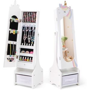 Organize your child's precious jewelry neatly with this jewelry armoire cabinet, featuring generous space with 18 earring slots, 13 necklace and bracelet hooks, 64 ring slots, 3 storage shelves, 1 small drawer and 1 foldable fabric drawer. Plus, the freestanding full-length dressing mirror with 2 tilt angles provides a complete and clear reflection that's ideal for daily outfit checks. To reinforce stability and security, this kids jewelry armoire is equipped with an anti-toppling device. Whether it's for a birthday, holiday, or any special occasion, this jewelry armoire cabinet will be the perfect gift for your little one, offering both style and practicality. If you are looking for such a product, do not hesitate to buy it! Full-length Mirror: This kids jewelry cabinet is equipped with a full-length mirror, which offers a clear head-to-toe view for kids to dress up. What's more, the mirror cabinet has 2 adjustable tilt angles to meet different needs. Large Storage Space: There are