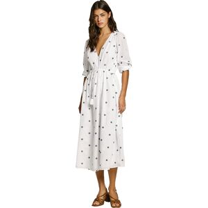 Long dress with deep v neckline and curved tunnel waistline.Inserted cord in tunnel with decorative tassels at end.Pockets in side seams.Gathering under shoulder yokes.Long voluminous sleeves held in buttoned cuffs.Composition:100% Cotton.