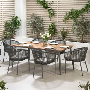 The Reims Grey Dining Set made in Vietnam, includes a wide slatted rectangular acacia wood dining table finished in a Light Teak colour and 6 Dark Grey dining chairs. The frame on all pieces is finished in a powder-coated metal in a tonal Anthracite colour. The weatherproof properties of the polyrope mean it will not absorb water ensuring a taught structure with no sagging but affording the ultimate in comfort along with the Light Linen Stone Grey fabric cushion. The cushions are season-proof and fire retardant, whilst the acacia wood is a tough, long lasting hardwood being environmentally friendly as it is also a fast growing wood, making it an excellent choice for outdoor furniture. The Reims chairs are also stackable, therefore, space saving when not in use. Sol 27 Outdoor