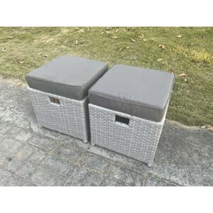 GENERAL DESCRIPTION This classic small footstool is made of premium light grey mixed rattan, designed to withstand British weather conditions. It includes an 8 cm thick seat cushion and comes fully assembled for immediate use. The footstool features a sturdy galvanized steel tube frame with powder coating to prevent rust and is suitable for both indoor and outdoor use. TECHNICAL SPECIFICATIONS Size: 40W x 40L x 34H cm Material: Light grey mixed rattan Cushion thickness: 8 cm Frame: Galvanized steel with powder coating Fully assembled: Yes OTHER INFORMATION The footstool has a handle for easy movement and features a removable cushion cover for low maintenance. It is recommended to keep the cushion indoors or covered when not in use.