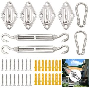【High-quality materials】: The awning hardware kit is made of high quality stainless steel. They are weather and rust resistant, sturdy and won't rust easily. Looks neat and good quality. 【40-piece sun sail fastening set】: The shade sail installation kit includes: spring hook x 2, carabiner x 2, wall bracket x 4, screw x 16, plastic extension x 16. 【High load】: Specially designed to prevent your shade sail from being blown away by fast wind or shaken by harsh weather conditions. The shade sail hardware kit will give you a great power experience. 【Easy to use】You can mount it between trees, wall to wall, wall to tree or wherever you like. After the wall brackets are attached to a stable wall, the corners of the awning can be secured with the carabiners, enjoy your cool summer. 【Customizable design products】The tensioner is adjustable, it is a device for adjusting the tension or length of ropes, cables, tension rods and other tensioning systems, you do not need to buy additional nails or