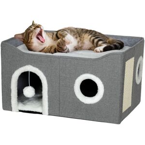 A cosy hideaway your feline friends will adore, this PawHut cat house features soft plush and linen-look fabric, gentle on paws and stable. Three side openings allow for playful darting, peaceful naps or quiet alone time, while the raised bed offers comfort and a vantage point to watch the world go by. The sisal scratch pad keeps claws healthy and away from your furniture. Easily fold it for compact storage and travel, giving your pets a comfortable space wherever you go. Specifications: ● Colour: Grey ● Material: MDF, sisal, plush (100% polyester), linen-look fabric (100% polyester) and PP cotton ● Overall dimensions: 34H x 60L x 40W cm ● Inside dimensions: 25H x 59.5L x 38W cm ● Cat door: 22H x 14W cm ● Round opening: Φ9.5 cm / Φ10 cm ● Scratching pad: 25H x 14.5W cm ● Top bed: 7H x 60L x 40W cm ● Safety standard: BS5852 ● Item label: D30-950V70GY Features: ● Features three side openings for hiding and resting ● Raised top bed offers a cosy perch for lounging and watching ● Soft