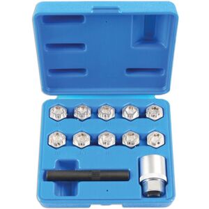 An 11-piece tapered 1/2""D socket set for removing wheel locking nuts where the original key is missing and/or the wheel nut is damaged. Suitable for tyre fitting bays and garages. 8 x conical dismantling sockets; length 60mm. Inner diameters: 18.5 - 15.6mm, 19.5 - 17.6mm, 20.4 - 18.5mm, 21.6 - 19.7mm, 22.5 - 20.6mm, 23.6 - 21.7mm, 24.5 - 22.6mm and 25.5 - 23.6mm. Air hammer adaptor allows use of the Laser air hammer (Part No. 6031) if required. Driven using a power bar such as Laser Part No. 1343. Manual fitting tool and removal punch manufactured from chrome molybdenum. Spare conical dismantling sockets available, please see Laser Part Nos. 60515 (18.5 - 15.6mm), 60516 (19.5 - 17.6mm), 60517 (20.4 - 18.5mm), 60518 (21.6 - 19.7mm), 60519 (22.5 - 20.6mm), 60520 (23.6 - 21.7mm), 60521 (24.5 - 22.6mm) & 60522 (25.5 - 23.6mm).