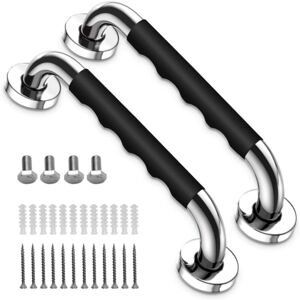 EXQUISITE DESIGN: The shower safety grab bar for the elderly is made of 304 stainless steel with black non-slip rubber grips, reasonable grooves that fit the palm of your hand perfectly for a comfortable feeling and can support up to 400 kg. WIDELY APPLICABLE: The suction of this shower grab bar is not only used as a grab bar, but also can be used as a towel rack to use or place hooks to catch clothes. Suitable for commercial and residential locations. EASY TO CLEAN: This shower grab bar is easy to clean, no matter where you place it, just rinse it randomly, wipe it gently and it is clean. Does not take much time to clean the grab bar. HIDING SCREWS: This shower grab bar allows you to bind the screws to the wall to hide them, you can install it anywhere you want, making your bathroom simple and elegant. Includes: 2 senior shower grab bars, 12 screws, 4 decorative base covers, 4 fixing hex nuts, 10 expansion nuts. Each size: 30x8x6 cm