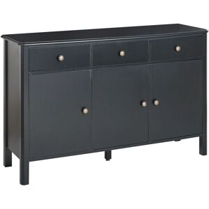 Modern Living Room Highboard Cabinet with Drawers. Bring an elegant look to your interior and make your space well-organised with this stylish sideboard. Made of high-quality MDF in black, it comes with pine wood legs and golden metal knobs with a distressed effect that add a touch of retro style. Thanks to capacious cabinets with shelves and drawers, the sideboard works well as a storage solution for any living room, dining room, or hallway. Details: Product Type: Sideboard Style: Modern General Color: Black, Gold Material Type: Wood Main Material: MDF Additional Material: Pine Wood Legs material: Engineered Wood Shelves number: 6 Doors Opening: Standard Drawers: Yes Finish: Painted Key Locked: No Number of Doors: 3 Number of Drawers: 3 Shelves: Yes Dimensions: Depth: 39 cm Width: 120 cm Height: 75 cm Weight: 40 kg Drawer Weight Capacity: 5 kg Top Weight Capacity: 20 kg Offer Includes: 1 x Sideboard Key Features: Featuring Different Types of Storage Space, Functional and Capacious