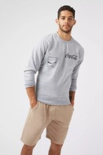 80% Ringspun Cotton, 20% Cotton. Design: Bottle, Bow, Holly Leaves, Logo, Printed. 280gsm. Hem: Ribbed. Neckline: Crew Neck, Ribbed Collar, Taped. Sleeve-Type: Long-Sleeved. Cuff: Ribbed. Fit: Loose. Fastening: Pull Over. 100% Officially Licensed. S: 42 in. M: 44 in. L: 48 in. XL: 50 in. XXL: 54 in. Coca-Cola Men's Bottle Bow Sweatshirt in Grey Size: XL