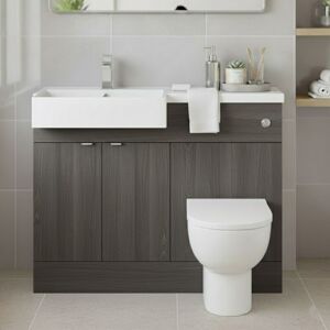 Features and Benefits: The anthracite woodgrain furniture range is ideal for subtly adding colour into your bathroom Supplied Complete with Vanity Unit, WC Unit, LH Square Basin, and 1.25m Continuous Plinth and Handle Our full depth units give ample storage, perfect for a busy family bathroom Our ready built combinations save on time and make your life easier Supplied with soft close doors as standard Made in the UK During installation extra care must be taken to avoid damaging the fittings Guarantee: 5 years against faulty workmanship or materials (1 year on serviceable and moving parts), please see manufacturer guarantee policy for more information Important Information: Tap, Waste, Toilet Pan, Cistern and Toilet Seat sold separately (Available in our Store) Standard Handle included, Other handle options sold separately (Choose from the above) Bathroom Furniture Type Combination Unit Furniture Width (Unit + Basin) 1005mm Furniture Height (Unit + Basin) 904mm Furniture Projection