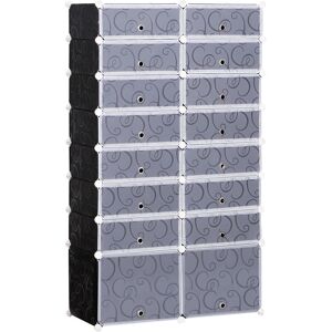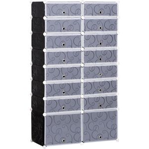 " Declutter your home efficiently with this semi-transparent shoe rack. Made from environmentally friendly plastic with a metal frame, this storage unit is tough for everyday use. Featuring 14 regular cube compartments and 2 larger to fit a total of 32 pairs, the shape is completely customisable to allow the organizer to fit your needs well. Simply connect using the ABS connectors. It is finished with a swirl pattern design on the front for an elegant look, no matter where it is placed. Specifications: • Item Name: Shoe Rack • Brand Name: HOMCOM • Colour: Black and white • Material: Plastic and metal wire • Overall Dimensions: 95L x 37W x 160Hcm • 14 x Small Cube Size: 45W x 35D x 17Hcm • 2 x Large Cube Size: 45W x 35D x 35Hcm • Weight Capacity: 30kg • Net Weight: 11.5kg • Flat Pack: YES • Package Includes: 74 x PP plate, 54 x plastic connector, 1 x small wooden hammer • Custom Label: 837-017 Features: • DIY design, allows you to fix the unit into any shape • Features 14 regular cubes