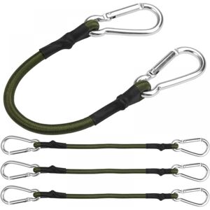 High-quality material: The bungee cord with hook is made of high-quality rubber, strong, durable and wear-resistant, ensuring good load-bearing capacity. The exterior is wrapped with durable polypropylene, tear-resistant and UV-resistant; woven material. Package and dimensions: You will receive 4 pieces of bungee cords with hooks, each bungee cord is 30 cm/11.8 inches long, has high elastic tensile strength and good resilience, can stretch to about 1 times the length. Metal carabiner: Each bungee cord with carabiner is equipped with carabiners on both ends, allowing you to easily secure items and luggage and reduce the risk of items moving or falling during transportation. The elastic luggage straps can also be connected together to extend the length and allow flexible use. Durable rope: The elastic rope with carabiner is made of 8mm thick latex, which is more elastic than ordinary elastic ropes, has a stronger load-bearing capacity, and provides a more stable and reliable connection.