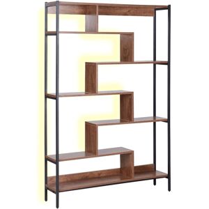Capacious Storage Bookcase with LED light. Organize the space in your room with this multi-purpose bookcase. Its simple, open design makes it a perfect addition in many different interior decor styles. The robust shelves are finished to resemble wood in a dark tone for natural ascent, while the black, steel frame gives an industrial flair to the piece. What is more, the bookcase comes with LED lights, which can be used to illuminate your interior with warm, colourful glow. Thanks to the adjustable feet, it will be perfectly balanced even on an uneven floor. Details: Product Type: Bookshelf Style: Industrial General Color: Brown, Black LED Colour Temperature: Warm White Material Type: Engineered Wood Main Material: MDF Additional Material: Steel Legs material: Metal Shelves number: 6 Drawers: No Finish: Melamine IP Protection Code: IP 20 LED Luminous flux: 200 LED Type: SMD 5050 LED: Yes Shelves: Yes Voltage rating: 12 V Dimensions: Depth: 27 cm Width: 120 cm Height: 180 cm Weight: 37