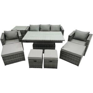 Sleek modern design meets outdoor durability! This sophisticated rattan set enhances any space - from urban balconies to country gardens. High-quality PE rattan and galvanized steel provide lasting beauty that withstands harsh British seasons. Set Dimensions: 1 x Three Seater Sofa : 177W x 65D x 66H cm; 1 x rising dining table: 140L x 80W x 68/48H cm; (height up 68,down 48) 1 x Chair :74W x65D x66H cm; 2 x Side Table Size: 65L x 65W x 66H cm; 2 x Fully assembled footstools Size: 40L x 40W x 34H cm; 2 x Big Footstool Size: 65L x 65W x 35H cm; Sofa Weight Capacity: 250kg; Table Weight Capacity: 80kg; Dark grey mixed rattan with dark grey fabric .Color may some difference due to light or monitor .we are unable to return the item due to color problem . Table Can Be Used Both For Coffee Or Dining TableGreat Price Compared With Other Online Or Offline Store For Rising Table Set Items Comes Flat Packed And Easy Assemble, Sturdy Galvanized Steel Tube Metal Frames With Powder Coating To Prevent The Rust. Flat PE Rattan Completely Made By Hand, 5mm Thickness transparent Tempered Glass With Sucker On Surface To Prevent Sliding. Low Maintenance ,Removable Cushion Cover And Easy Move To Different Place. Pls Keep the Cushion Indoor Or put on With Rain Cover When Not In Use . Keep The Furniture With Rain Cover If Not Use For Long Time . 8 cm Thick Seat Cushion With Soft Pillow Back Cushion Gives You More ComfortFactory Direct sale Guarantee The Quality And After Sale Service Fimous Rattan Lounge Sofa Rising Dining Table Set & 2 Side Tables 4 Footstool in Dark Grey
