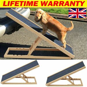 About this item: 【HEIGHT ADJUSTABLE】- The pet ramp can be adjusted to 2OR 4 heights which helps your pets easily reach the car, bed or couch. The pet ramp is self-supporting and does not need to be placed on the vehicle or furniture. 【SAFE & STURDY】- Sturdy solid wood construction is not easily broken, not prone to mold, which can offer strong support. The ramps are independently safety tested and rated to support pets up to 100lbs / 55kg. 【NON SLIPING FABRIC】- This pet ramp use cross-grained paw traction mat, non slip and safer. The high traction fabric carpet surface feature grooves prevent your furry friend from slipping when walking on the ramp. 【EASY TO STORE】- The portable pet ramps fold down flat so you can easily store it in your car, under your couch or bed without taking much space. 【WIDE APPLICATION】The pet ramp help your pets easily reach the bed, couch or car all by themselves to have a good time together. It’s suitable for senior dogs/puppies/dogs with short legs, and