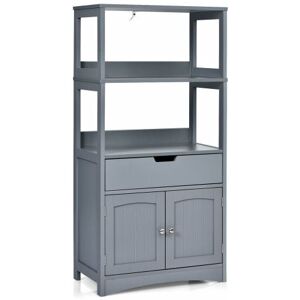Do you need a storage cabinet with a small footprint and large capacity to keep your home tidy? Made of high-quality MDF, it is strong enough to ensure long-term use. It has 2 open shelves, 1 drawer and 1 cupboard, which can place lots of items you need. The anti-toppling design can fix it on the wall to protect the safety of you and your family. In addition, the instructions provided with the storage cabinet are very detailed, saving you a lot of assembly time. It is suitable for bathroom, kitchen, study room. Features: Large storage space for anything you need Easy to install due to its detailed instruction Smooth handle can easily open or close the door Anti-toppling device makes the cabinet safe to use Waterproof surface is good for use in the bathroom Made of premium MDF to ensure adequate durability Suitable for bathroom, entryway, kitchen, study room Composed of 2 open shelves, 1 drawer and 1 cupboard Specifications: Color: Grey Material: MDF, Engineered Wood Overall Dimension:
