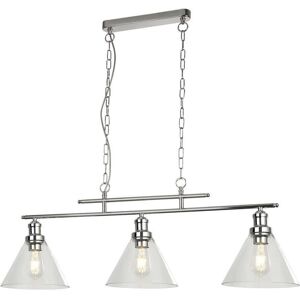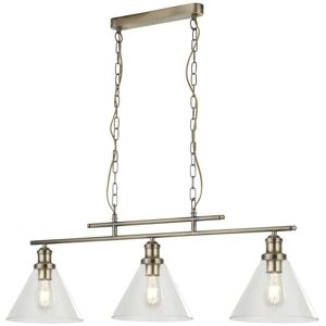 Specification Searchlight Pyramid - 3 Light Pendant Antique Brass, Glass Shade, E27 Finish: Antique Brass Material: Steel IP Rating: IP20 Height (cm): 33 Length (cm): 95 Width (cm): 23 No. of Lights: 3 Lamp Type: E27 Dimmable: Yes Wattage (max): 60W Class: 1 (Earthed) Bulb Included: No Description Perfectly suited to dining rooms or above kitchen islands, the Pyramid 3 light pendant is a classic design with a modern twist. Designed with clear glass shades and a simple antique brass finish chain. This product is a great choice for anyone wanting to update their interior.