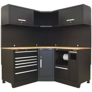 Sealey Premier™ Corner Storage System with Hardwood Worktop 1.71m Features: All steel construction with graphite powder coat finish. Brushed aluminium drawer pulls and handles. Heavy-duty drawers with rubber liners and precision ball-bearing drawer slides. Concealed snap-close magnets on doors. 25mm Hardwood worktop. Gas struts on wall cabinet doors. Adjustable feet to ensure cabinets sit 'true' even on floors that are not level. High quality cylinder locks and two keys where applicable. Technical Details: • Package includes: • Model No. - Description • APMS15 - 930mm Heavy-Duty Modular Corner Floor Cabinet • APMS16 - 930mm Heavy-Duty Modular Corner Wall Cabinet • APMS17 - 930mm Back Panel Assembly for Modular Corner Wall Cabinet • APMS18 - 930mm Hardwood Corner Worktop • APMS20 - 775mm Heavy-Duty Modular Multifunction Floor Cabinet • APMS03 - 775mm Heavy-Duty Modular 6 Drawer Floor Cabinet • APMS13 - 775mm Heavy-Duty Modular Wall Cabinet (x2) • APMS10 - 775mm Modular Back Panel (x2)