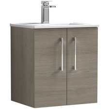 Complete with a trendy woodgrain effect finish, this space-saving vanity unit from Nuie's extensive Arno collection comprises 2 soft-closing doors and a handy internal shelf for added storage capacity. A choice of 4 finishes and 4 different basin designs can completely change the look of this unit, making it one of our best-sellers. This Arno vanity unit design is also available in several satin and gloss finishes - available separately. Features and Benefits: Space-saving wall-hung vanity unit measuring 500mm wide On-trend textured bleached oak woodgrain finish Includes mid-edge ceramic basin with deep 40mm profile Unit includes 2 doors, each with 95-degree soft-closing hinges Supplied with 2 x chrome bar handles (alternative finishes available as upgrades) Cabinet constructed from 16mm MFC with 18mm MDF fascia Vanity unit supplied rigid - no assembly required on the carcass/cabinet Unit includes pre-drilled blind holes for installation of handles (supplied loose) Compatible with