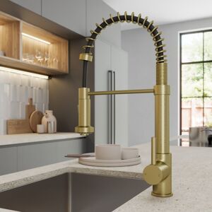Designed with style and functionality in mind, this pull-out kitchen mixer tap from ArtiKitch is the epitome of kitchen tap styling. With its beautiful brushed brass finish and enhanced performance, you'll experience a kitchen tap like no other. Suitable for low-pressure systems and made from robust brass, it’s the only choice for a busy household that wants equal amounts of form and function. Stylish yet functional with ultra modern round design Stunning brushed brass finish to complement your perfect kitchen Convenient pull-out hose and swivel spout 1.5m hose length for practicality Durable and built to last with its solid brass construction Single lever tap controlling the temperature and flow Flexible tails included for installation Suitable for low pressure systems Reliable composite disc cartridges that are long lasting FREE 5 year guarantee for complete peace of mind Precision-designed Kitchen Mixer These kitchen mixer taps blend water from both your hot and cold feed using the
