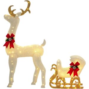 An enchanting scene for your christmas outdoors, with the HOMCOM Christmas reindeer decorations. Formed of a Buck, a Doe and a Fawn, all together and complementing each other. Made from metal, the frames are solid: they keep in shape to be used time and again. covered in 300 LED lights, this garden reindeer lights the area beautifully - great for night times! With an IP44 rating, it is water-resistant - suitable for covered outdoor use. Specifications: - Colours: White, Red - Light Colour: Warm White - Type: LED Light Up Reindeer and Sleigh - Materials: PP, Steel - Overall Dimensions: 59L x 29W x 118Hcm (Reindeer) 50L x 29W x 42Hcm (Sleigh) - Power Cord Line Length: 5 m - LED Light Power: 0.03 W - Input Voltage: 220-240 V, 50/60 Hz - Output Voltage: 4.5 V/3.6 W - Item Label: 844-995V70WT Note: Please do not plug it into the socket before installation Features: ● Light-up Christmas reindeer and sleigh: a pretty piece for your Christmas display ● 170 warm white LED lights for gentle and