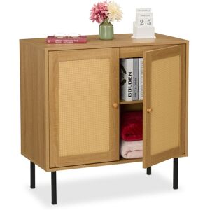 This chest of drawers creates plenty of storage space with its 2 flexibly adjustable cupboard compartments. Whether for crockery and kitchen utensils in the kitchen, games and books in the living room or clothes in the bedroom - the side cabinet is versatile. Decorative items or plants can be displayed on the top shelf. The wooden-look high chest of drawers with its 2 rattan-look doors and contrasting black metal legs is visually impressive. Chest of drawers in detail - Dimensions H x W x D: approx. 80 x 80 x 40 cm - Shelf H x W x D: approx. 1 x 76.5 x 36 cm - Possible shelf heights: approx. 16-35.5 cm - Load capacity: max. 50 kg - Weight: approx. 18.3 kg - Material: Wood-based material, iron, PP plastic - Colour: natural, black Versatile side cabinet - Plenty of storage space thanks to 2 spacious compartments - Perfect for the kitchen, living room or bedroom - Decorative design in wood and rattan look - Black metal legs set visual accents - Ideal for storing crockery, clothes, books