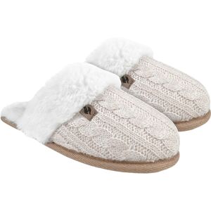 Heat Holders - Ladies Aria Cable Knit Faux Fur Thermal Scuff Slippers: Introducing the Heat Holders Ladies Aria Cable Knit Faux Fur Thermal Scuff Slippers in Cream, designed to provide superior warmth and comfort. These slippers feature Heat Holders renowned thermal technology, ensuring your feet stay warm and cosy. With a plush, soft Heatweaver insole lining and a cable knit design, these slippers offer both style and functionality for those cold days at home. The multi-layered foam midsole adds comfort, insulation, and support, while the textured outer sole helps keep you dry and provides added traction. Whether you're lounging around or heading to the kitchen, these slippers will keep your feet comfortable. The faux fur lining provides an extra touch of luxury and warmth. Available in sizes S (3-4), M (5-6), L (7-8), and XL (9-10), these slippers are perfect for pairing with your favourite Heat Holders socks. Ideal for gifting or treating yourself to a cozy and stylish slipper experience. Extra Product Details: Material: Upper: 64% Acrylic, 36% Polyester, Lining: 100% Polyester, Filling: 100% Polyester, Outer Sole: Thermoplastic Rubber Includes: Faux fur thermal slippers with multi-layered foam midsole Features: Textured sole for traction, Heatweaver plush lining Care: Spot clean as needed. Essential for those looking to keep their feet warm and stylish throughout the colder months.