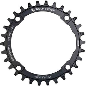 104 bcd 4 bolt round chainring with patented Drop-Stop® design for improved chain life, chain retention.Drop-Stop B chain compatibility optimized for SRAM 12-speed drivetrains (T-type) and Road Flattop chains.Features.-Use:MTB.-Type:Round.-Anchoring/Mounting:Bcd 104mm.-Weight according to sprocket:32T - 41g 34T - 48g 36T - 55g.-Material:Aluminum 7075-T6.-Color:Black.-Made in the USA.USA.Compatibility.-Chainring compatible with any 104 BCD crankset.-Designed to meet the requirements for electric bicycle use.-Wolf Tooth´s patented Drop-Stop® wide/narrow tooth profile for maximum chain retention and sludge removal capability.-For 1x9, 1x10, 1x11, 1x12 drivetrains (including SRAM Eagle).-If using a 9-speed drivetrain, use a 10-speed chain (shifts and works well on a 9-speed drivetrain and adjusts the chainring tighter for better chain retention).-Quarq power meter compatible with 34t and 36t sizes.Filing is required for 32t mounting on some older Quarq Power meters.No modifications are required for the DUB Quarq Power meter.-Threaded to use M8 pan bolts (no nuts required).-Maximum diameter is that of a chainring 2 teeth larger than the size you order (so make sure there is enough clearance for the chainstay).-Drop-Stop B chain compatibility:compatible with all SRAM Eagle, SRAM Road and Transmission (T-Type) Flattop chains, 9, 10 and 11-speed chains or KMC 12-speed, Connex, Wippermann, Campagnolo.-*Not compatible with 12s Shimano HG+ or 13s Campagnolo chains.Recommendations:-If you plan to ride in very muddy conditions, we recommend a chain guide (such as GnarWolf or LoneWolf ) in addition to a clutch-type rear derailleur.Without these precautions, you may experience chain falls and/or chain slippage.Recommend the use of a clutch style rear derailleur for the best chain security.