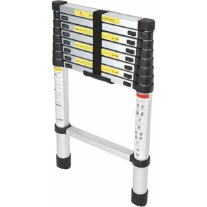 GENERAL DESCRIPTION This is a high-quality aluminum telescopic ladder with a foldable design, making it convenient to use and easy to carry. It can be quickly extended and adjusted to suit various heights, and it can be stored away easily when not in use. This ladder is suitable for both indoor and outdoor activities, such as accessing lifts, cleaning windows, painting, and decorating. TECHNICAL SPECIFICATIONS Material: Aluminum Open Height: 2.6m Max Load: 150kg Wall Thickness: 1.3 & 1.5mm Gap Between Rungs: 28cm Closed Size: 72cm x 47cm x 9cm COMPATIBILITY AND ACCESSORIES Compatible with various indoor and outdoor tasks.