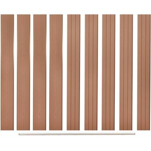 Our fence boards with an ending bar are the replacement for our fence panel sets (SKU 3053207-3053224, 3054430). They can be used as garden barrier or residential fence for privacy and security. These WPC boards have a wood grain print on one side and regular print on the other side, so you can choose the design you like best. Our wood-plastic composite fence boards do not require any additional treatment like oiling or painting. They are very durable and resistant to rot or rust. Thanks to the aluminium top profile, the boards can be tightly attached to each other, which increases their rigidity and strength against impact. Designed with the modular system, the fence boards allow you to expand the fence freely. Delivery includes 9 WPC boards and 1 ending bar. Please note that these fence boards are the replacement for our fence panel sets (SKU 3053207-3053224, 3054430) and we also offer replacement posts (SKU 49076-49077 and 148986-148987). Colour: Brown Material: Wood-plastic