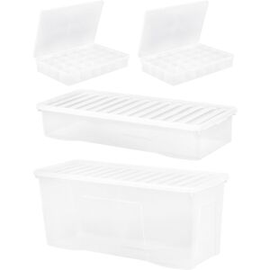 A 4 piece high quality festive tree, decoration and 2 bauble box set in Clear. If you love storage and Christmas, this complete festive storage solution will not only bring you joy this xmas season, but after and much more in many years to come. Forget the dusty storage bag or broken carboard box; once dismantled your Xmas tree will be lovingly and safely stored to perfection. Lights and garlands will be tangle free, gift wrap and trinkets undamaged and those precious baubles will be preserved for the future. We've designed these boxes/organisers with transparent sides and transparent lids to make it easy to view the contents. The boxes are stackable when in use and nest inside one another when not. Made right here in the UK. Contains: 1x 133L Crystal Clear Plastic Storage Boxes; Dimensions (approx): 99 x 39.5 x 42.5cm 1x 55L Crystal Clear Plastic Storage Boxes; Dimensions (approx): 99 x 39.5 x 18cm 2x Bauble Boxes; Dimensions (approx): 59.5 x 39.5 x 10cm Dimensions are taken from the largest point (outer edge of the box for Storage purposes). Wham