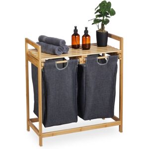Store your dirty laundry neatly until the next wash. Two pull-out laundry baskets provide discreet storage and pre-sorting for your dirty clothes. The single large shelf and three smaller shelves offer additional space for towels, detergent, and more. With its modern design and combination of bamboo and fabric laundry bags, this functional laundry sorter and bathroom shelf is a stylish addition to your bedroom or bathroom. Laundry Basket Shelf in Detail - Overall dimensions H x W x D: approx. 80 x 100 x 32 cm - Capacity per laundry bag: approx. 34 litres - Material: Bamboo, polyester - Total weight: approx. 8.6 kg - Colour: Natural, grey, white Bathroom Shelf for Pre-Sorting Laundry - Large shelf dimensions W x D: approx. 100 x 32 cm - Load capacity of large shelf: approx. 15 kg - Small shelf dimensions W x D: approx. 29 x 30 cm - Load capacity of small shelves: approx. 5 kg each - Load capacity of laundry bags: approx. 10 kg each Practical Laundry Rack in a Mix of Materials
