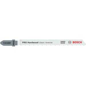 Lasts up to 5x longer than a Bosch T101BR Jigsaw Blade Most jigsaw blades cut upstroke and the long-lasting PRO Hardwood clean reverse T101BRF offers a simple solution to professionals who want to see the top of their workpiece while getting the clean cuts they need: it has a reverse tooth-design and cuts downstroke. We made the PRO Hardwood clean reverse T101BRF Jigsaw Blade from Bi-Metal: it has a high-speed steel (HSS) tooth strip bonded with a high-carbon steel (HCS) body to ensure you can tackle hardwood and laminate boards for a long time. The blade has a tapered shape and fine-pitched teeth with a reverse design helping you get tear-free cuts on the top of workpieces up to 30 mm thick. Fits all T-shank jigsaws Tested in Bosch labs according to Bosch standard procedures. Features and Benefits: • Lasts up to 5x longer than a Bosch T101BR Jigsaw Blade • Fits all T-shank jigsaws • Fine-pitched teeth with a reverse design for tear-free cuts on the top of workpieces; suitable for hardwood and composite wood, like laminate boards • Highly effective for carpenters and woodworkers: Long Life Specifications: Material: BIM Tooth design: ground teeth and taper ground Total length [mm]: 100 Tooth spacing [mm]: 2.5 Tooth pitch [TPI]: 10 Areas of application: Laminated panels (3–30 mm), kitchen worktops (3–45 mm), clean surface Recommended min. material thickness [mm]: 3 Recommended max. material thickness [mm]: 30 Type: T 101 BRF