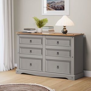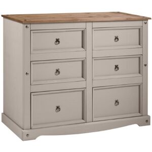 Brambly Cottage is happy to offer this 6-drawer wide chest, with a subtle grey wash body that allows the natural grains and textures of the wood to show through it offers a beautiful modern twist on a classic design while retaining all the characteristics that it is known for and loved for. The item is expertly crafted from solid pine and hand-waxed to protect, preserve as well as enhance the grain. With 6 drawers it offers outstanding value for money that would be a welcome addition to any home. Finished off with decorative metal fittings which give the item its distinctive Mexican styling and offer that warm rustic country charm. Brambly Cottage Colour: Grey