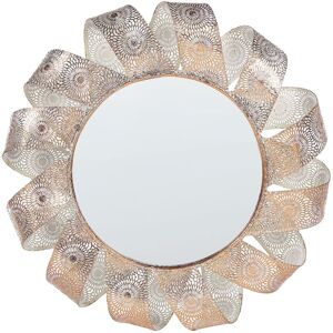 Decorative Lace Frame Mirror. Charming and elegant, this ribbon wall mirror brings a touch of fairy tale to any room. The beautifully ornate, open, lace frame is crafted from high-quality metal and finished in warm tones of white with copper hints. This rich decoration gives your space a vintage look, and makes a great statement to your living room, bedroom or hallway, as well as visually enlarging it. Details: Product Type: Wall Mirror Style: Glam General Color: White, Copper Material Type: Metal Main Material: Iron Additional Material: Glass Shape: Round Finish: Brushed Dimensions: Depth: 4 cm Width: 54 cm Height: 54 cm Weight: 2 kg Offer Includes: 1 x Mirror Key Features: Enlarges Interior Visually, Eye-Catching Accent Piece, Makes Your Interior Stylish, For Indoor Use Only, Various Arrangement Possibilities Assembly Information: Does Not Require Assembly Maintenance tips: Iron: 1.Clean with dry shampoo and a wet sponge or a mild cleaner 2.Vacuum with a suitable attachment. Glass: