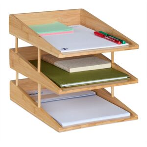 With this modern document holder, you can tidy up your desk in the office or home office. The upright document holder has 3 tiered compartments. Organise your post, files and other documents clearly so that you always know what has already been dealt with and what you still need to take care of. The letter stand in a mix of metal and bamboo also looks great as a magazine rack in the living room or for organising your recipes in the kitchen. Document Holder in Detail - Dimensions H x W x D: approx. 20 x 29 x 14 cm - Compartment heights: approx. 10 / 12.5 / 15.5 cm - Dimensions per compartment W x D: approx. 27.5 x 3.5 cm - Weight: approx. 0.7 kg - Material: Bamboo, iron - Colour: Natural, black Standing Document Holder with 3 Compartments - For organising letters, documents and much more - For tidiness and organisation on the desk - Can also be used in the kitchen or living room - Material mix and mesh look for a modern look - Plenty of storage space in 3 compartments with stepped