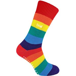 THMO thermal slipper socks have been made with a heavy bulk acrylic yarn with extreme thermal qualities. They have been double brushed on the inside to maximise warmth by trapping warm air and keeping it close to your feet. This brushing also softens the inside of the sock making it a great choice for indoor relaxing. The funky and bright striped rainbow design of these socks are perfect if you want to jazz up your feet around the house. It also makes them a must-have for your sock drawer. These thermal socks also feel like they are seamless with a neat hand-linked toe. The ribbed welt at the top of the sock has been designed to rest to the natural contours of your legs. This wide soft top provides all day comfort and will reduce the chances of nasty constriction rings developing around your legs. The THMO badge is also heat transferred onto the side of the sock. This is the THMO slipper version of the thermal socks. An anti slip grip has been designed onto the foot of the sock in order to prevent you from slipping on surfaces such as hard wooden floors or kitchen tiles. It is a simple but effective dotted design on the foot of the sock. This is very handy if you are using our thermal socks to lounge around the house instead of going outdoors and using them for walking and hiking. These THMO thermal slipper socks are available in a rainbow colour, the grip is a white dotted design. They are available in 2 sizes - Men’s 6-11 UK 39-45 Eur 7-12 US and Ladies 4-8 UK 37-42 Eur 5-8 US. They are made from 93% Acrylic, 7% Polyamide. They are also safely machine washable.