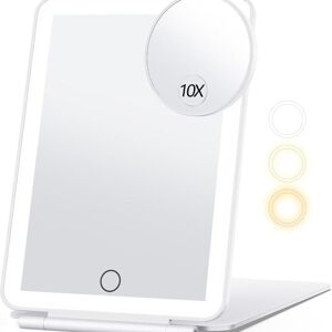 Rechargeable Travel Mirror: The makeup mirror features a built-in 2000mAh large-capacity battery, which can be used at any time via laptop charging, mobile power, or a wall charger. Portable, ultra-thin, and foldable, it easily fits in your backpack, making it suitable for travel, home, or other makeup occasions. 10x Magnifying Mirror: The package includes a 10x magnifying mirror, allowing you to clearly see every detail and ensure your makeup is perfect. Suitable for eyeliner, eyebrows, and lipstick. 75-90 degree free rotation angle allows you to easily find the desired vanity mirror angle. 3-color lighting: 3 light modes allow you to see your makeup changes in different lighting conditions. White light is 98% similar to sunlight and is suitable for going out, natural light is suitable for office use, and yellow light is suitable for parties and dinners. Adjustable brightness and touch control; The mirror features highly sensitive touch control. Press the screen switch to change the