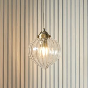 The Whitham from the iconic brand Laura Ashley is a gorgeous contemporary ceiling pendant light featuring a fluted solid glass shade, with a feature fold twisted fabric cable. Perfect for a retro style of decor in a stairway or the dinning room. FEATURES * Ceiling pendant light * Antique Brass finish * Fluted solid glass shade * Takes 1 lamp * Double insulated * Dimmable with suitable lamp / dimmer switch * Height adjustable at the point of installation SIZE * Drop: 28 - 127 cm * Diameter: 19 cm BULBS * Requires 1 x SES LED Candle Lamp - NOT INCLUDED