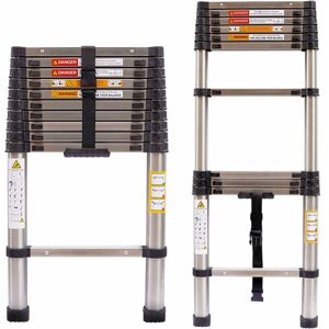 About this item 【HIGH-QUALITY STAINLESS STEEL TELESCOPING LADDER】Safety is our first prerequisite. Our 10.5FT/3.2M telescopic ladder is made of durable high-quality stainless steel. Compared to the aluminum extension ladders, stainless steel telescopic ladders are stronger and harder and have a longer service life. It can hold up to 330Lbs and is EN131 tested to keep you safe. 【COMPACT PORTABLE LADDER】Folded ladder size: 31.10" x 18.11"; weight: 22Lbs. This10.5 feet telescope ladder is lightweight and easy to carry. Comes with storage straps and an easy carrying handle, making it easy to use, and store. Our retractable ladder can be stored under the bed, behind the cabinet or behind the door, and so on. 【EASY TO USE】Extendable ladder high-quality construction ensures that each section expands and retracts safely. Every step has a double height-locking latch that opens and closes individually for anti-pinching your fingers or hands. Non-slip foot covers more firmly and safer,