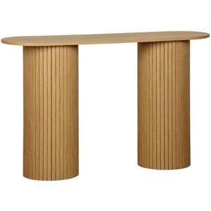 The product benefits : Scandinavian style Original form Bring a touch of sophistication to your interior with the Legacy oval console, perfect for enhancing the aesthetics of an entryway or decorating a bare wall. This Scandinavian-designed furniture piece stands out with its oval tabletop and round legs, both made of high-quality laminated panels with an elegant grooved wooden effect. The console's finish adds a subtle and authentic warmth to your space while maintaining a modern and clean look. The two sturdy legs provide perfect stability and complete the minimalist look. With its unique oval shape, the Legacy console is both a functional piece and a decorative element that stands out in your interior. You just have to place your favorite decorative objects and a very beautiful bouquet of flowers. CHARACTERISTICS Material: Laminated panels Shape: Oval Number of shelves: 0 Number of legs: 2 Style: Scandinavian DIMENSIONS Console: L 120 x D 35 x H 75cm Tabletop: L 120 x W 35cm Panel